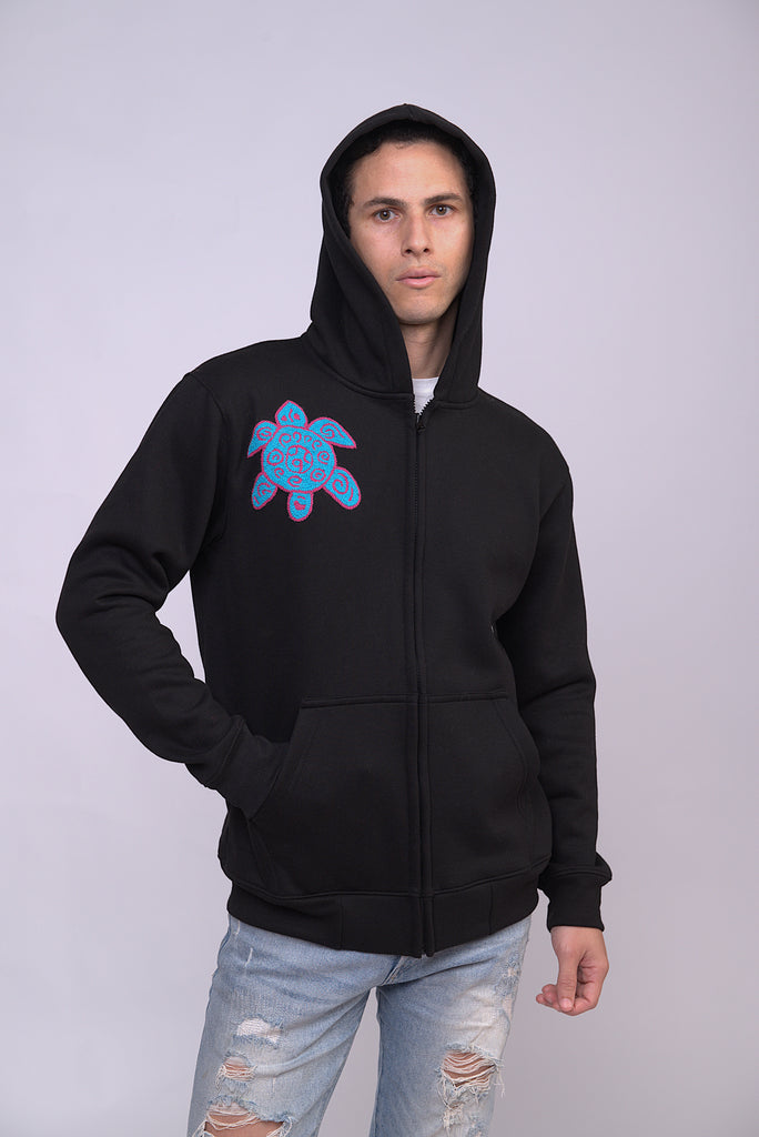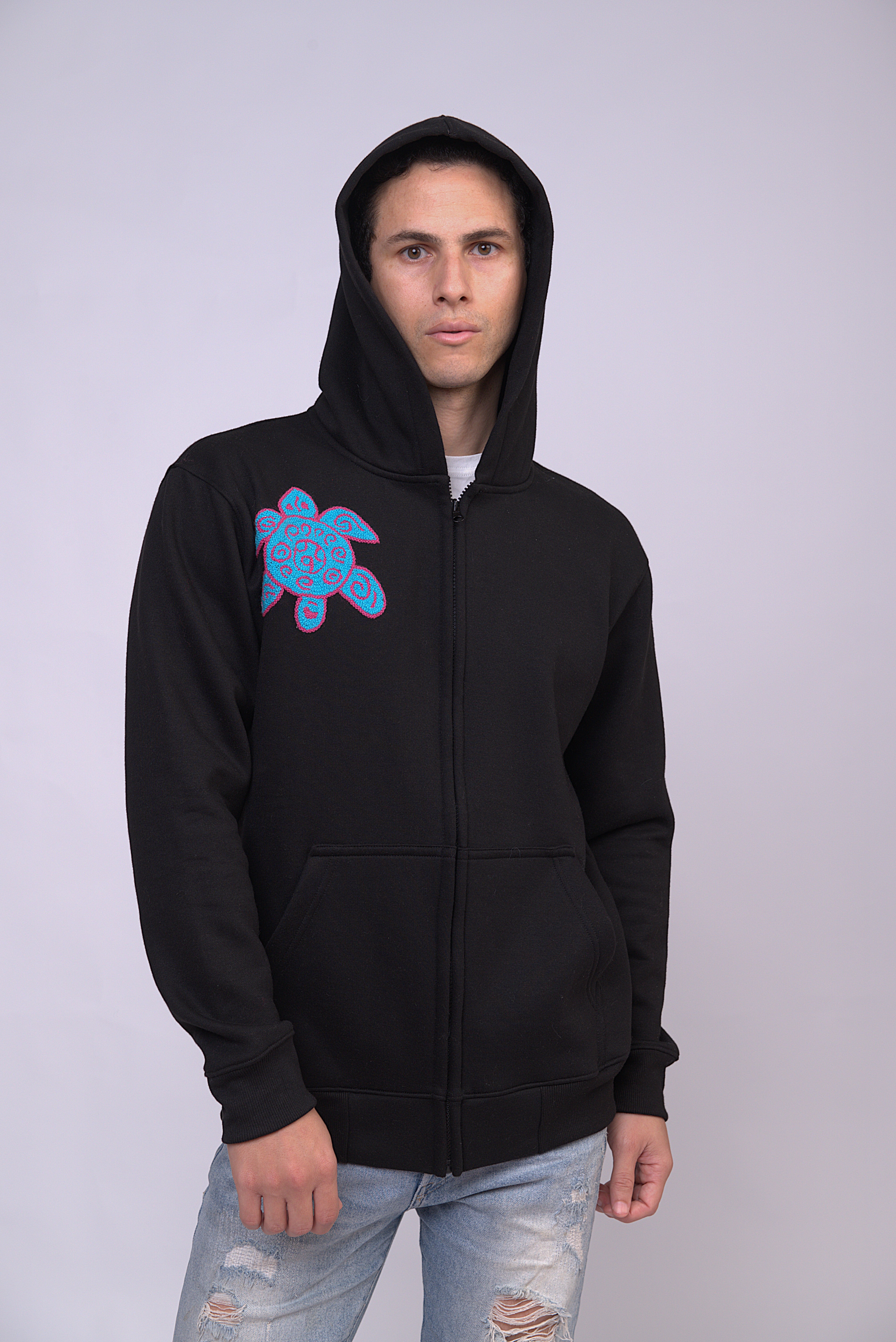 Full-Zip Hood perfects everyday comfort and durability. Crafted from a 50/50 blend of cotton and polyester, this hoodie features a YKK metal zipper, pill-resistant air jet yarn, and a cozy unlined hood. Have unique embroidery make by hand in Ayacucho Peru.